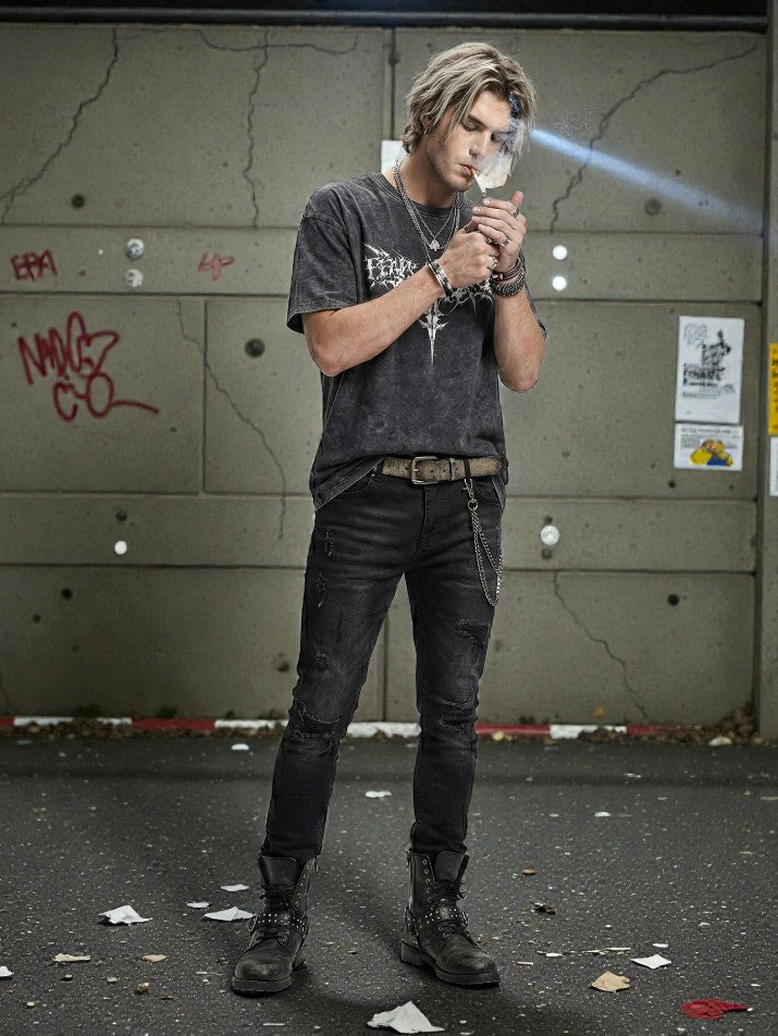 This acid wash oversized tee brings raw grunge attitude with a heavy, worn-in feel. The faded print and washed finish give it a distressed, underground look, while the baggy silhouette keeps it loose and unapologetic. Made from heavyweight cotton, it holds structure without losing comfort. Built for grunge styling, it pairs best with wide-leg pants, chains, and rugged street footwear.