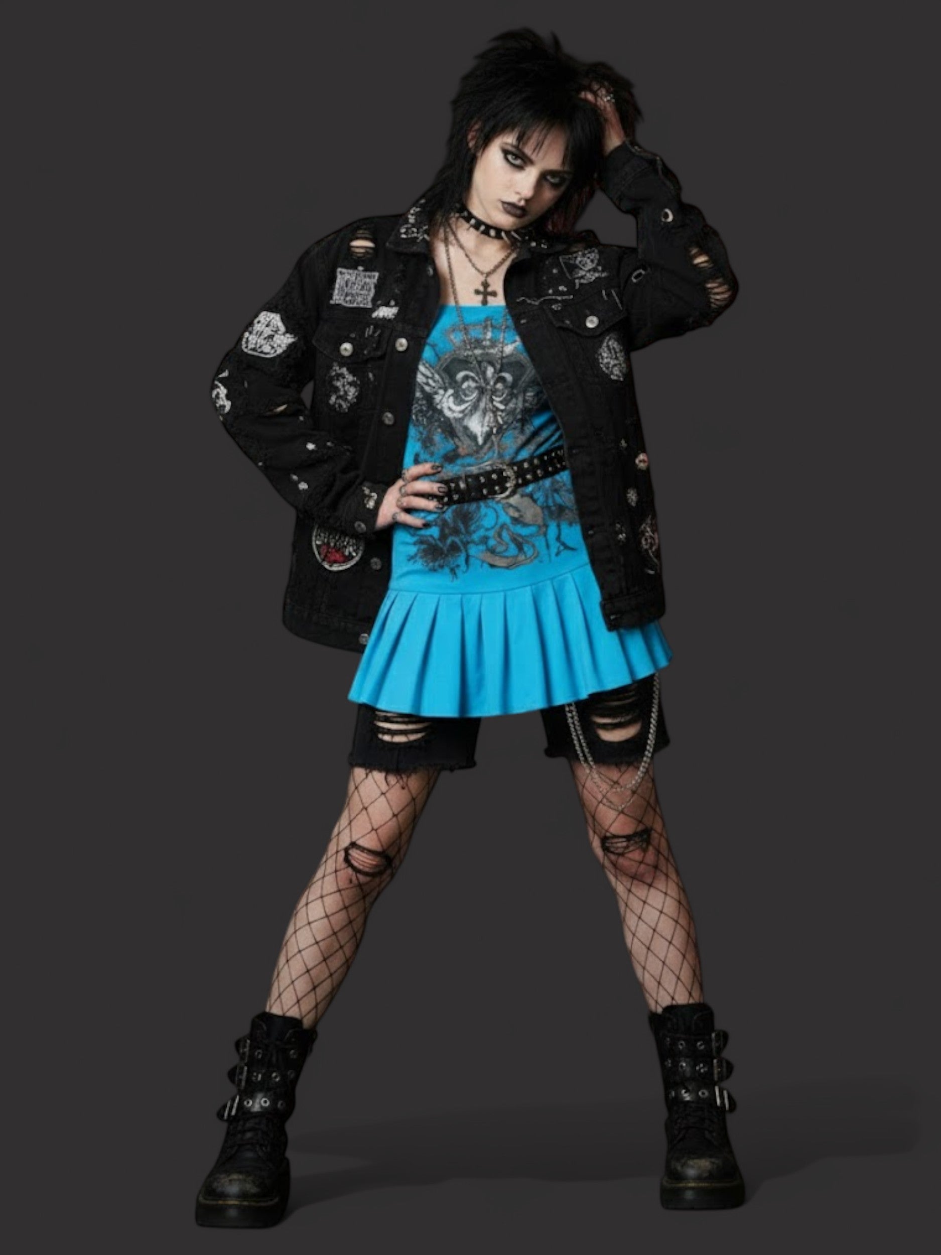 This Y2K blue mini dress brings a bold, aesthetic high-street look with its striking graphic print and flattering slim fit. The tie-up spaghetti straps and fitted bodice shape the waist naturally, while the pleated hem adds a playful silhouette.