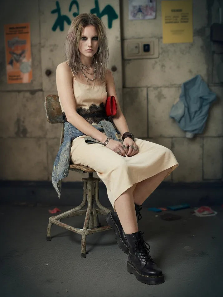 This backless lace patchwork maxi dress delivers raw grunge energy with a dark, stripped-down elegance. The off-shoulder neckline and lace detailing create a broken, exposed silhouette that feels worn and underground. Cut long with a flowing A-line shape, it moves effortlessly while keeping a heavy, nocturnal presence. Built for grunge styling, it pairs best with platform boots, chains, and layered dark accessories.