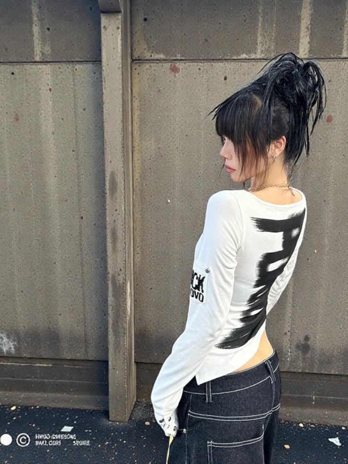 This slim-fit long sleeve tee blends American retro influence with a sharp Japanese-inspired grunge edge made for e-girl and festival styling. The asymmetrical neckline and button detailing add a worn, rebellious feel while keeping the silhouette clean and fitted. Crafted from a soft cotton–spandex blend with slight stretch, it’s comfortable for autumn layering and pairs easily with low-rise denim, mini skirts, or heavy accessories for a raw grunge look.