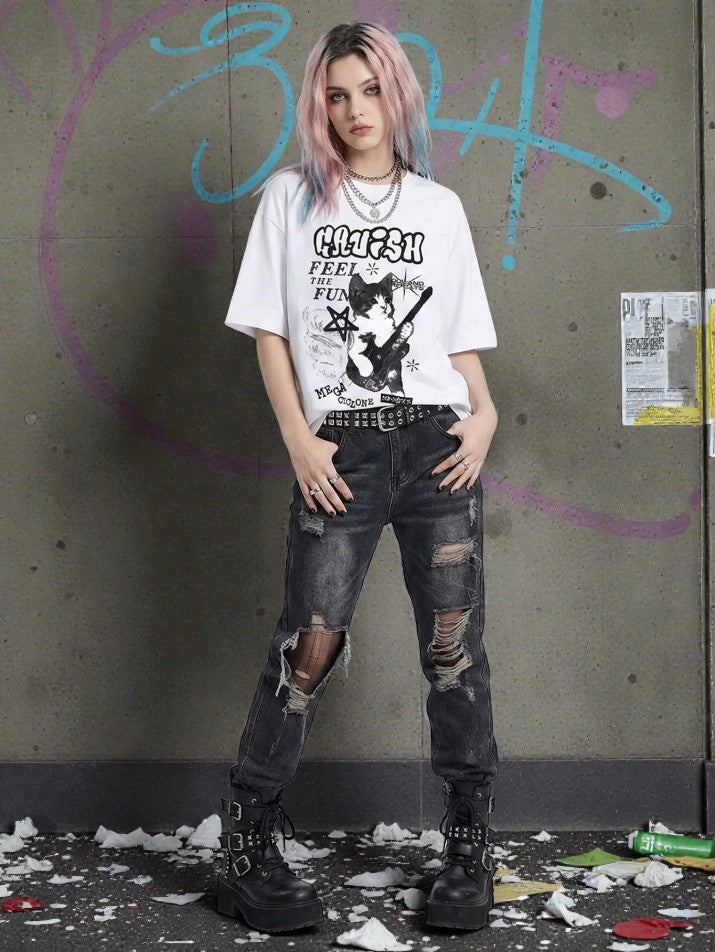 This cat rock graphic tee brings raw grunge energy with a loose, laid-back edge. The guitar-playing cat graphic feels ironic and worn, giving the piece a gritty, underground character. Cut oversized with a relaxed drape, it’s easy to wear through warmer seasons while keeping a rough, unpolished look. Built for grunge styling, it pairs effortlessly with baggy denim, layered chains, and scuffed sneakers.