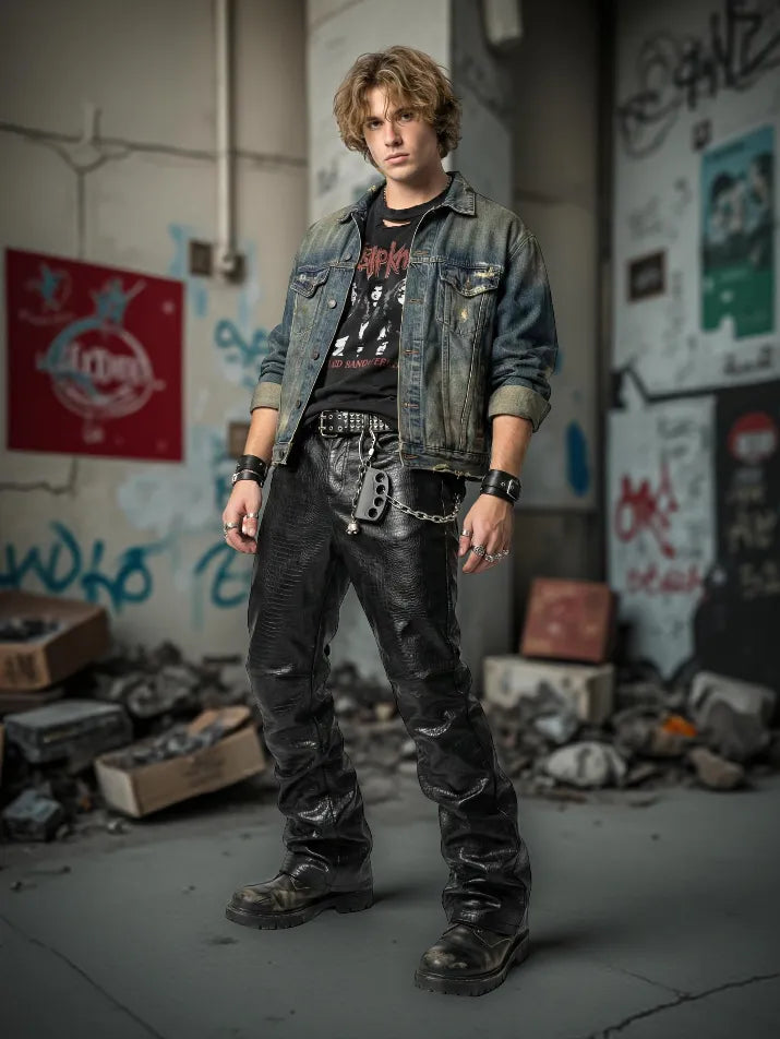 These crocodile print leather pants deliver raw grunge energy with a dark, high-impact edge. The textured faux leather finish feels aggressive and heavy, giving the piece an underground, confrontational presence. Cut loose with a straight-leg silhouette, they sit bold on the body for spring and autumn wear. Built for grunge styling, they pair best with oversized tops, chains, and rugged boots.