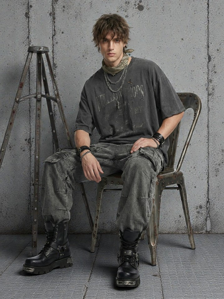 Grunge cargo jeans built with a heavy, baggy silhouette and a dirty, worn-down presence. Made from a cotton and polyester blend, they feel sturdy and structured while keeping a raw, lived-in texture. The wide-leg cut, pleated details, and stacked pockets give the pants a bulky, utilitarian weight. Distressed washes and fake zipper accents add a broken, rebuilt look. Designed for grunge outfits that feel rough, oversized, and unapologetically chaotic.