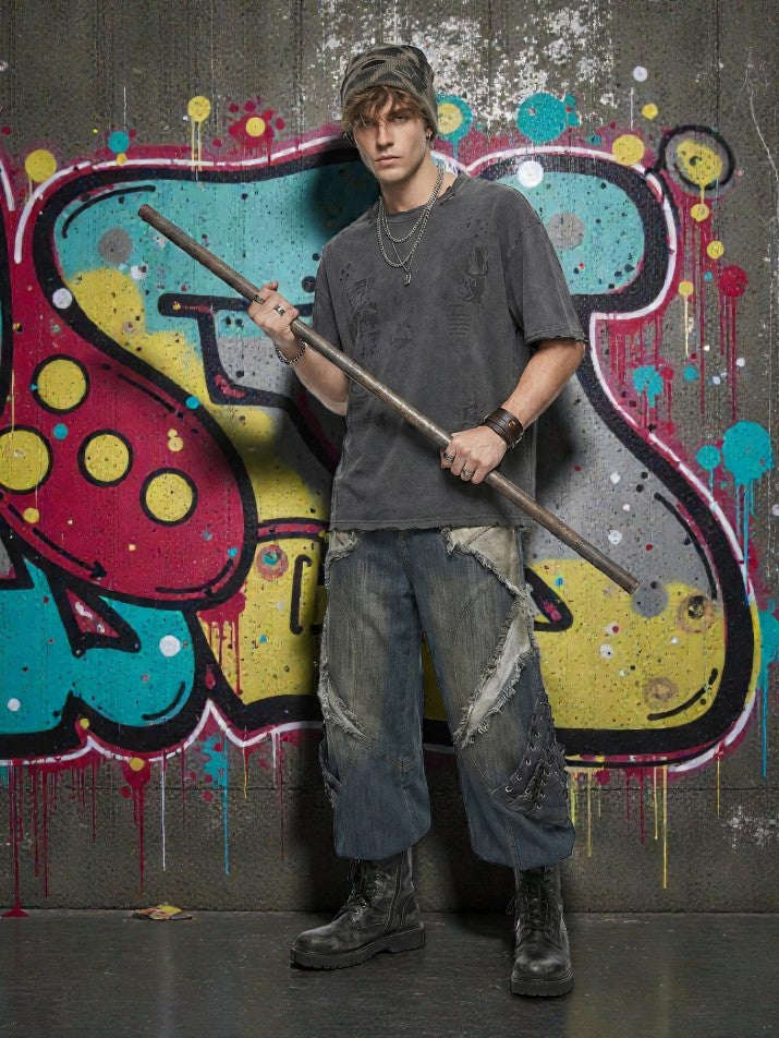 Grunge denim pants built with ripped holes and deconstructed patchwork for a raw, worn-down look. The wide-leg silhouette creates a heavy, baggy shape that feels unapologetically rough. Distressed washes and torn details give the jeans a lived-in, broken texture. Made from sturdy denim, they hold their form while keeping a brutal, underground presence. Designed for cold-season grunge outfits that look damaged, expressive, and fearless.