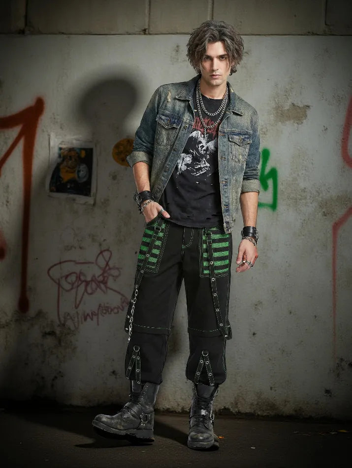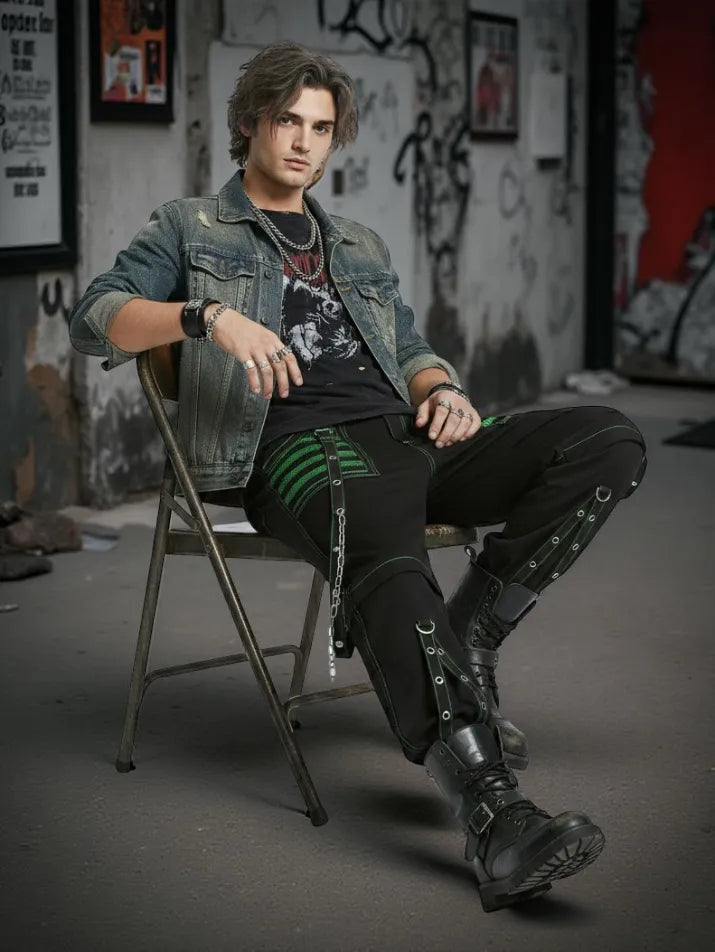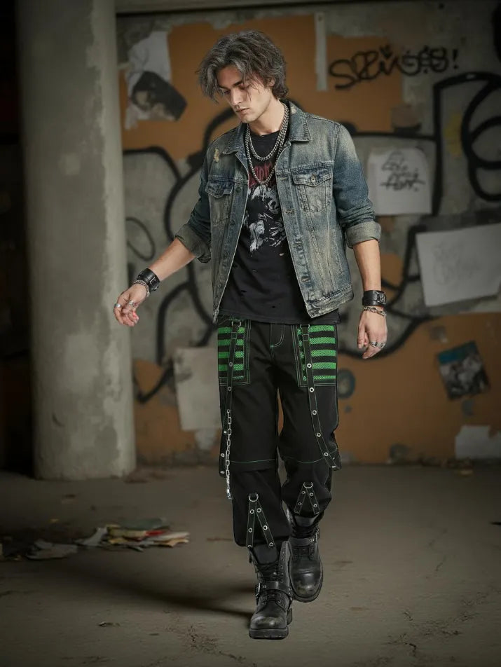 These high-waist wide-leg jeans deliver raw grunge energy with a dark, cyber-tinted edge. The loose silhouette and deep wash give them a heavy, underground feel, while the button detailing adds a subtle industrial touch. Cut to sit high on the waist with a baggy drape, they move effortlessly while keeping a rough, unpolished look. Built for grunge styling, they pair best with cropped tops, chains, and platform footwear.