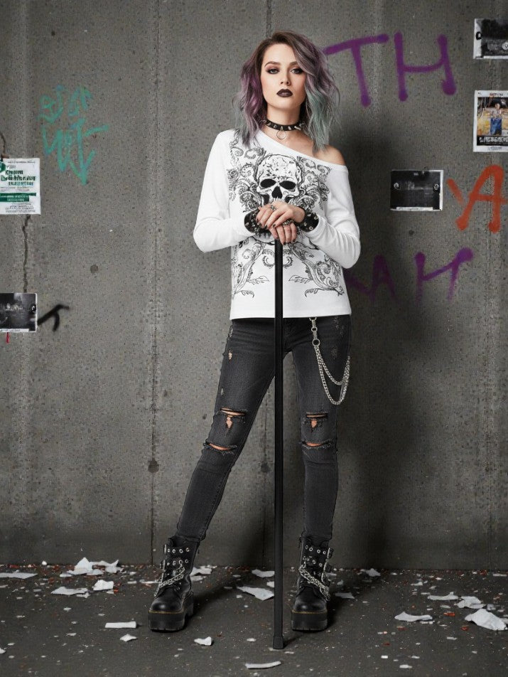 This off-shoulder skull tee delivers raw grunge energy with a dark, distorted edge. The slouched neckline exposes the shoulder for a broken, undone silhouette, while the skull print adds a worn, underground feel. Slim-fitting with light stretch, it sits close to the body without losing comfort. Built for grunge styling, it works perfectly with layered chains, mini skirts, or distressed denim.