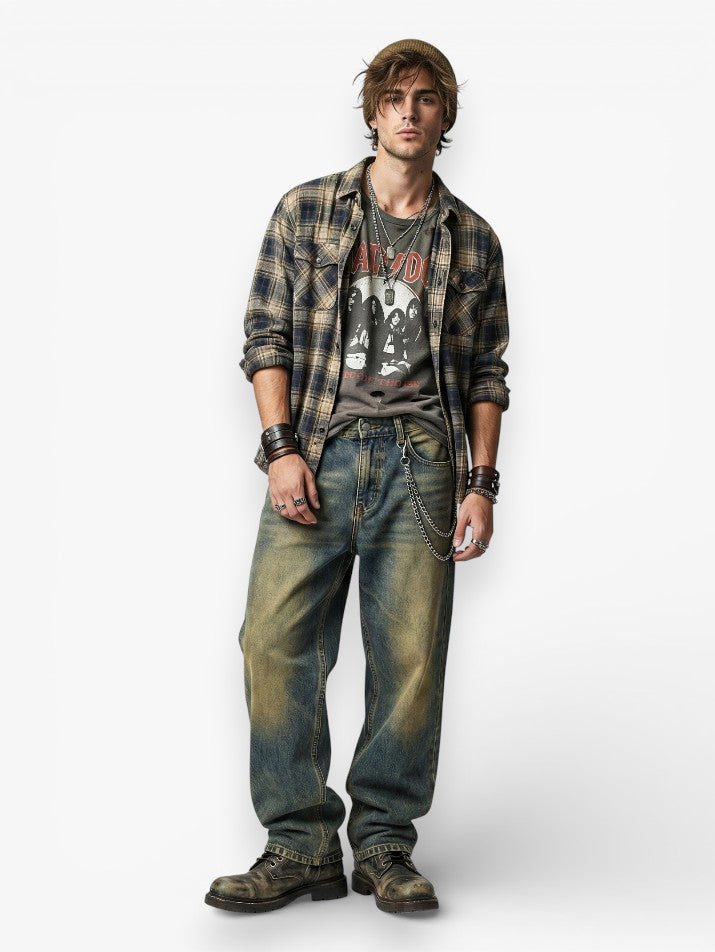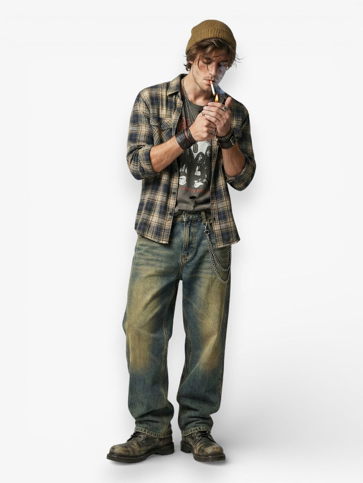 These retro baggy wide-leg jeans deliver raw grunge energy with a heavy, distressed edge. The washed denim and loose silhouette create a worn, underground look pulled straight from American street scenes. Cut mid-rise with a relaxed drape, they sit rough and unpolished for everyday wear across all seasons. Built for grunge styling, they pair best with oversized tees, chains, and rugged street footwear.