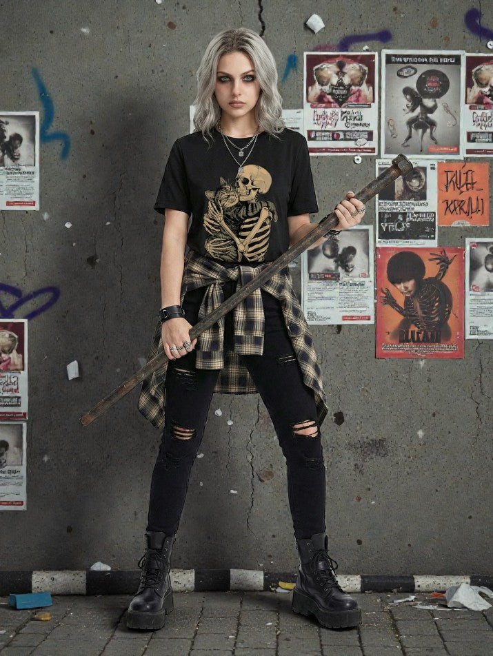 This skeleton cat graphic tee carries a gritty grunge mood with a darkly playful edge. The hugging skeleton and cat print feels worn-in and ironic, blending softness with an underground attitude. Cut in a classic crew-neck silhouette, it sits easy on the body with lightweight comfort for summer wear. Built for grunge styling, it works best with distressed denim, layered chains, or muted street looks.