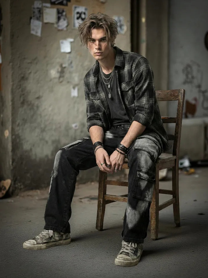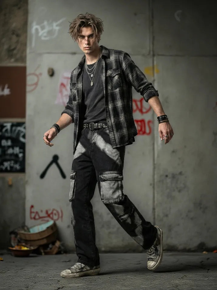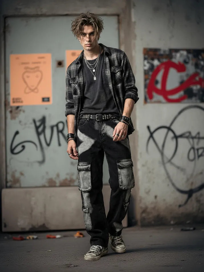 These wide-leg cargo jeans fuse punk streetwear attitude with a raw tie-dye finish. The washed denim features geometric tones and utility pockets that give the pants a rugged, multi-layered look. A mid-rise waist and relaxed cut keep them comfortable for all-season wear, while the heavy street silhouette leans into hip-hop and goth styling. Built to stand out, they pair best with oversized tops, boots, and layered accessories.