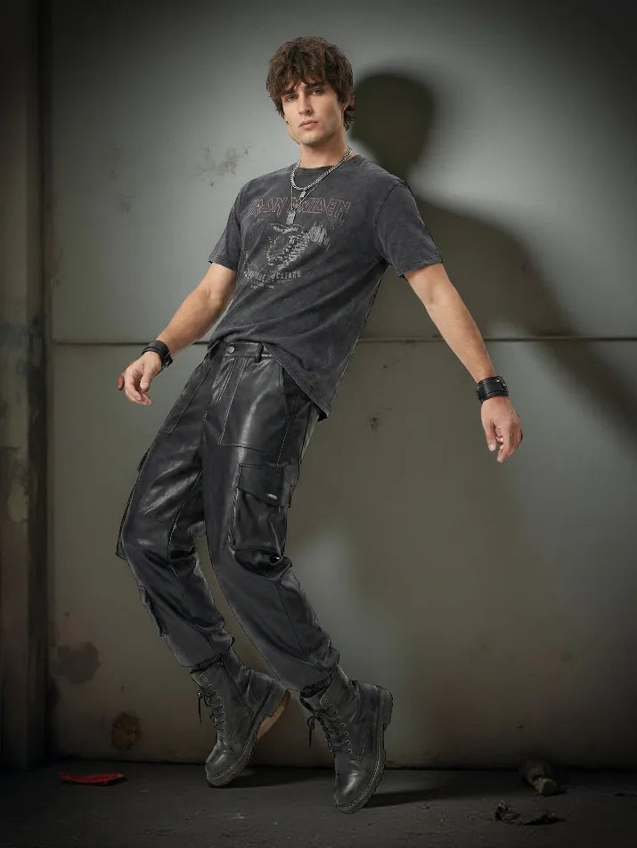 These West Coast leather cargo pants deliver raw grunge energy with a heavy, street-hardened edge. The multi-pocket build and rugged leather construction give them an underground, old-school attitude. Cut loose for everyday movement, they sit bold and unpolished on the body. Built for grunge styling, they pair best with oversized tees, chains, and worn boots.