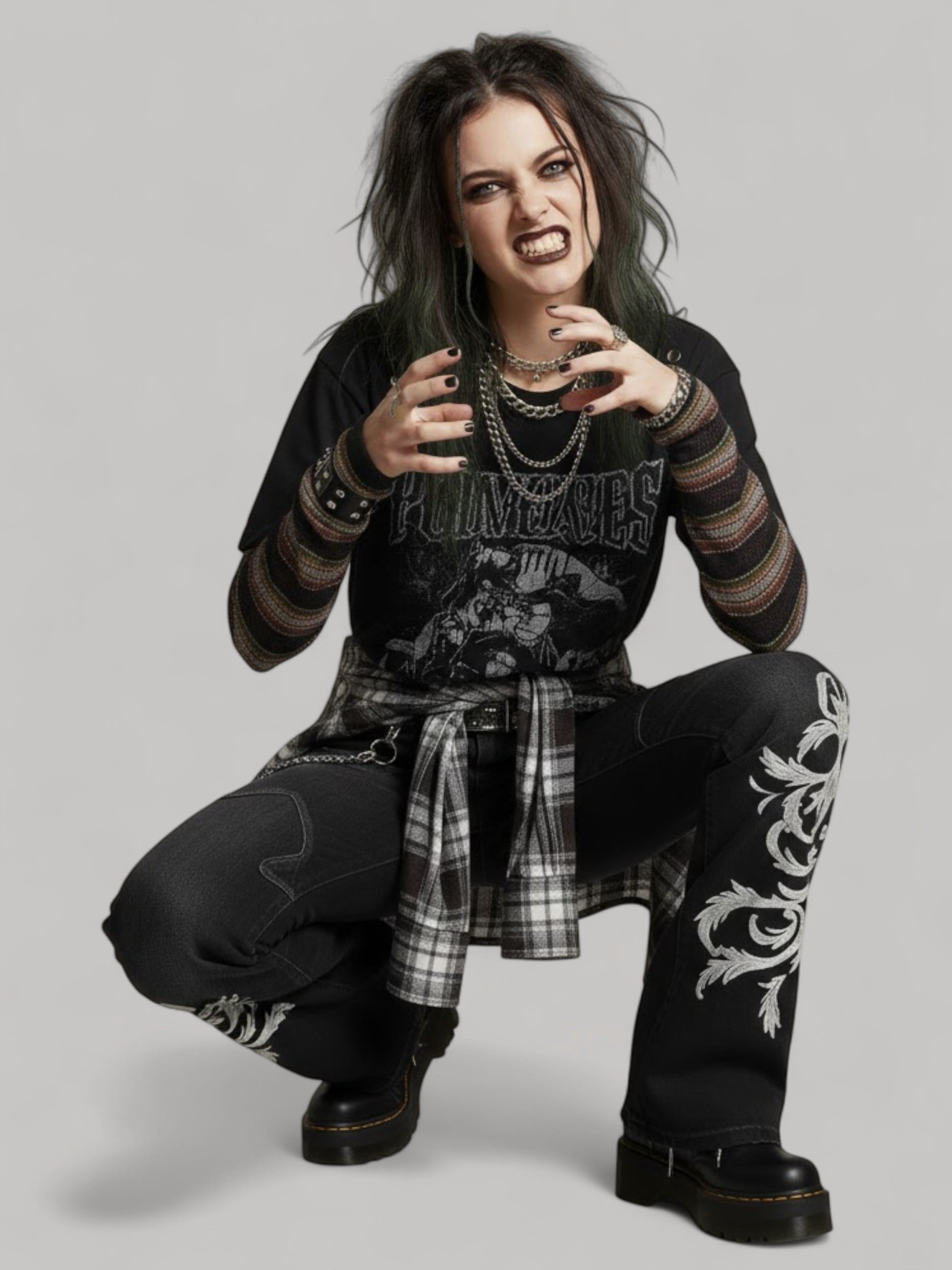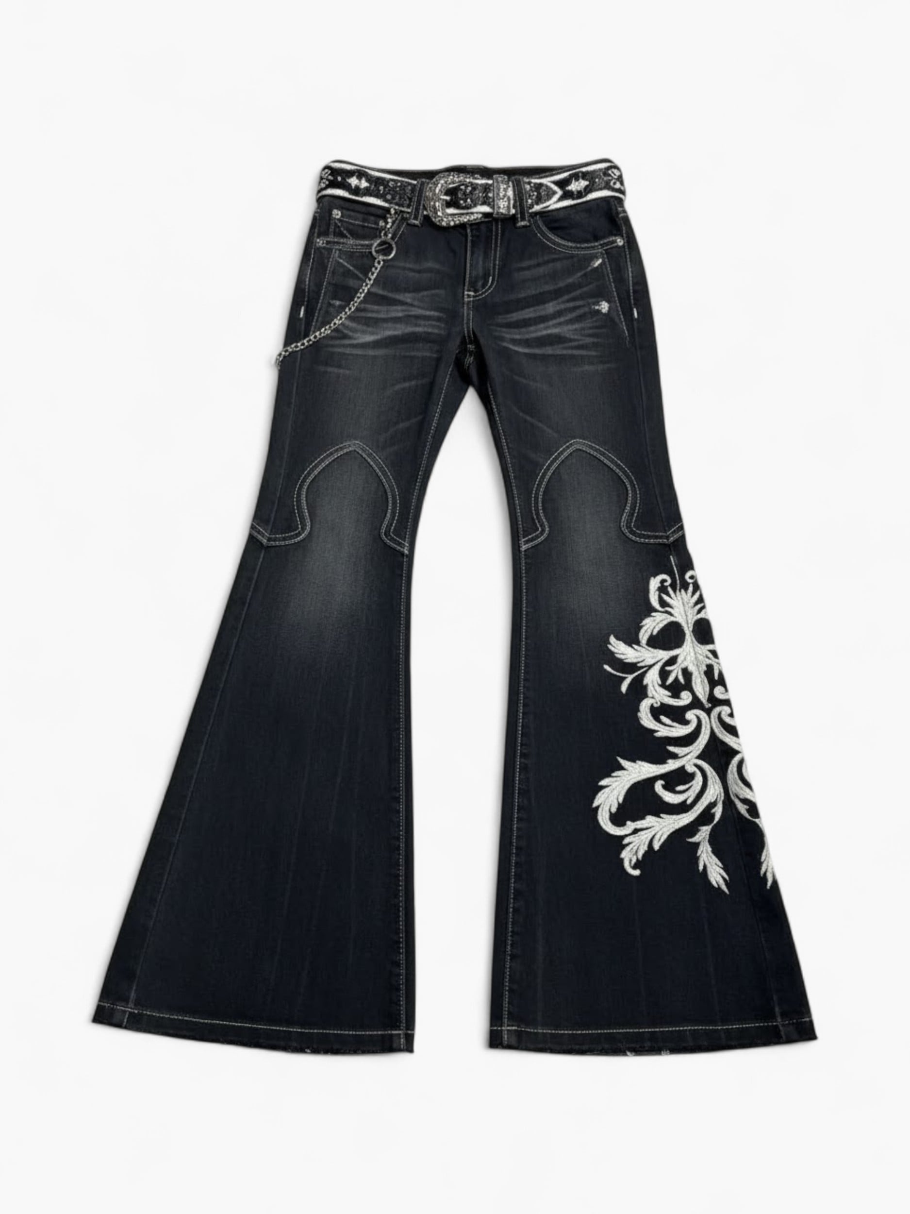 These Y2K flare jeans bring a strong retro punk vibe with their embroidered details, distressed hems, and slim-to-wide leg shape.