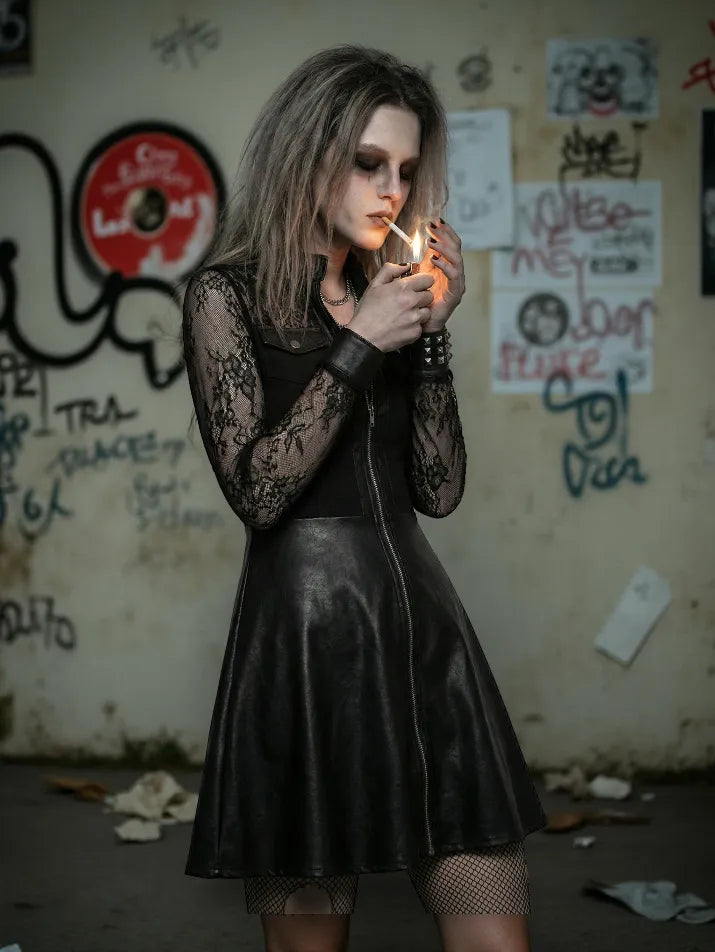 This zipper patchwork mini dress delivers raw grunge energy with a sharp, club-ready edge. The stand neckline and lace-panel patchwork create a fractured silhouette, while exposed zippers and pocket details add a worn, industrial feel. Cut slim with long sleeves, it hugs the body in a tight, unpolished profile. Built for grunge styling, it pairs best with platform boots, chains, and dark layered accessories.